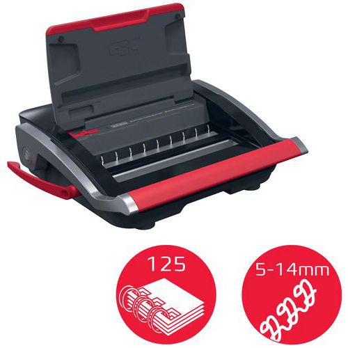 - Maskinen kan stanse op til 15 ark 80 g/m² papir ad gangen og indbinde op til 125 ark med 14 mm trådspiraler.