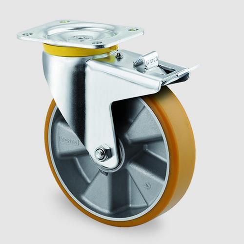 Industrihjul med kuglelejer, som kører let på både hårde og ujævne underlag. Aluminiumhjul, samt slidbaner af polyuretan. Anvendelsesområde: Vogne, racks, bådstativer m.m. Holderen til belastninger på 250 kg er fremstillet af forzinket stålplade med dobbelte svingkranslejer. Holderen til belastninger på 500 kg og derover er fremstillet af kraftig forzinket stålplade med dobbelte svingkranslejer samt smørekop i svingkransen.