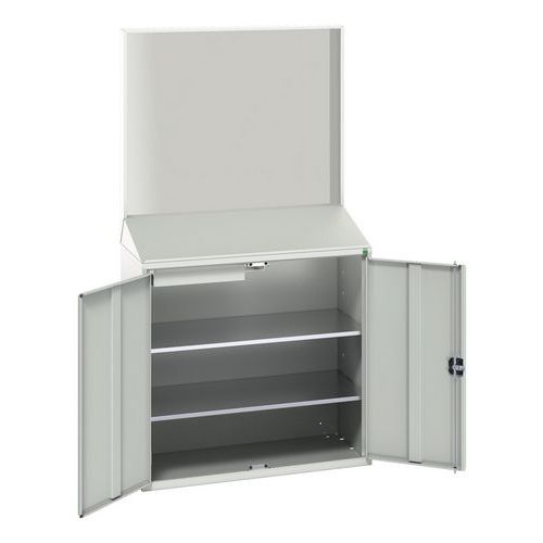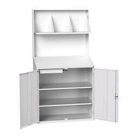 Konsultationsstation udstyret med bagpanel og høj hylde. Skrånende skriveflade. Underskab udstyret med 2 galvaniserede stålhylder og 1 skuffe. Forstærkede dobbeltdøre og integrerede håndtag. Låsbar.