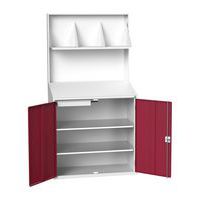 Konsultationsstation udstyret med bagpanel og høj hylde. Skrånende skriveflade. Underskab udstyret med 2 galvaniserede stålhylder og 1 skuffe. Forstærkede dobbeltdøre og integrerede håndtag. Låsbar. Fremstillet i Storbritannien