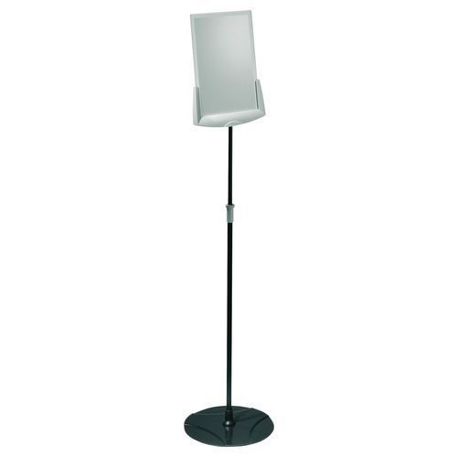 - Højdejusterbart fodstativ med skilteholder. Fod og stativ med ridsefast belægning. Nem at aflæse takket være den justerbare skilteholder.