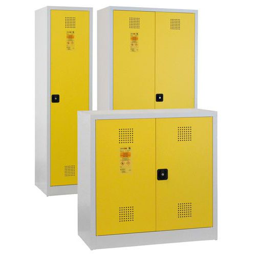 - Skabet har en robust, enkeltvægget konstruktion i pulverlakeret stål (RAL 7035 – lysegrå) og døre i RAL 1018 – zinkgul for tydelig sikkerhedsmærkning.