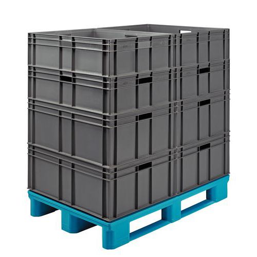 Plastpalle, der er nem at rengøre for at sikre optimal hygiejne. Absorberer stød med særlige bremsede felter. Let at flytte med en gaffeltruck eller palleløfter. Tykt dobbeltlagsbund for øget stivhed.