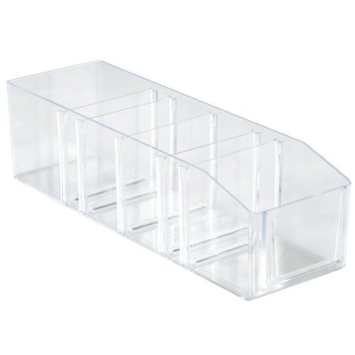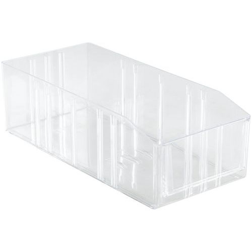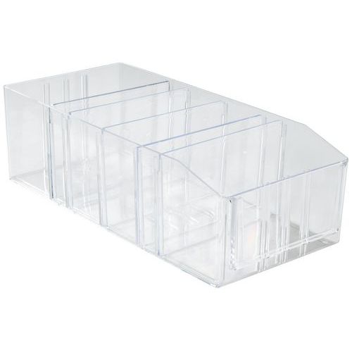 Meget robust. Plukkekasse med rum. Sænket front, som giver bedre overblik over indholdet. Glatte sider og bund. God bestandighed mod syrer. Leveres med etiket og etiketholder.