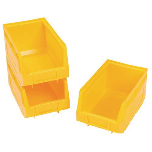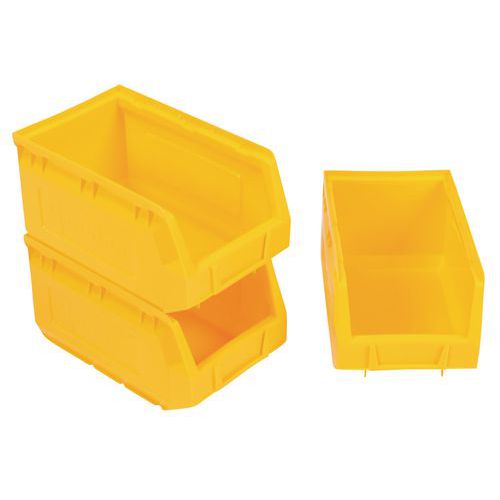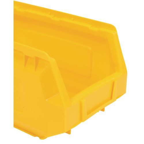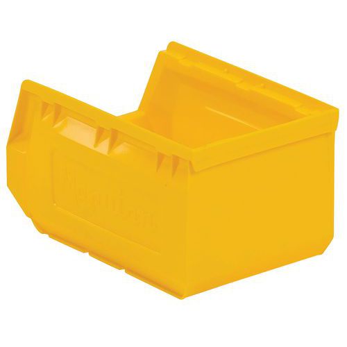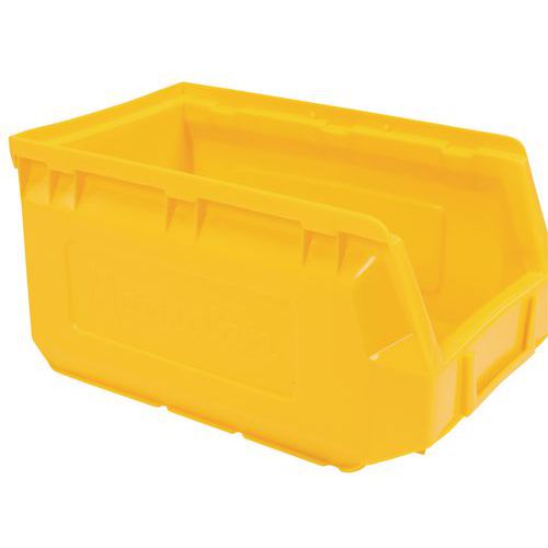 Ideelle til montering på bakkepaneler og til organisering af et hvilket som helst arbejdsområde. Perfekt til opbevaring af små dele og komponenter. Polyethylen af topkvalitet og høj densitet med forstærkede sidevægge, der giver ekstra styrke og stivhed. Særdeles bestandige over for olier, syrer og høje og lave temperaturer. Integreret etiketholder foran på kassen (blanke etiketter findes som ekstraudstyr). Kan bruges fritstående, stablede, på hylder eller monteret på bakkepaneler. Farver: rød, gul, grøn eller blå. Fremstillet i EU
