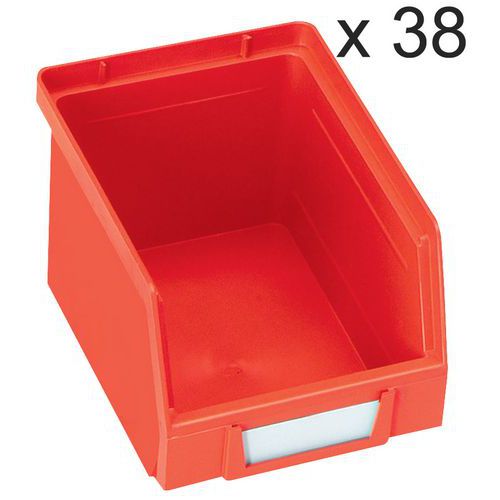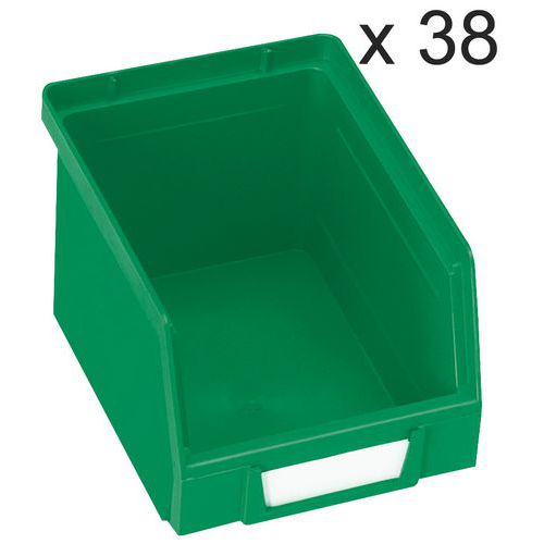 Ideelle til montering på bakkepaneler og til organisering af et hvilket som helst arbejdsområde. Perfekt til opbevaring af små dele og komponenter. Polyethylen af topkvalitet og høj densitet med forstærkede sidevægge, der giver ekstra styrke og stivhed. Særdeles bestandige over for olier, syrer og høje og lave temperaturer. Integreret etiketholder foran på kassen (blanke etiketter findes som ekstraudstyr). Kan bruges fritstående, stablede, på hylder eller monteret på bakkepaneler. Farver: rød, gul, grøn eller blå.