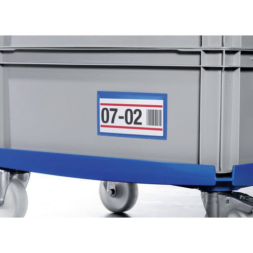 Tydelig og overskuelig mærkning af hylder, skabe, døre, paller, containere og andre steder forbedrer og effektiviserer arbejdsgangen på lagre og produktionsanlæg. De selvklæbende plastlommer/etiketholdere af slidstærk polypropylen kan aflæses med scanner og beskytter de udskiftelige etiketter mod snavs. To klæbestrimler på bagsiden betyder, at etiketholderen sidder godt fast og ikke falder af.
