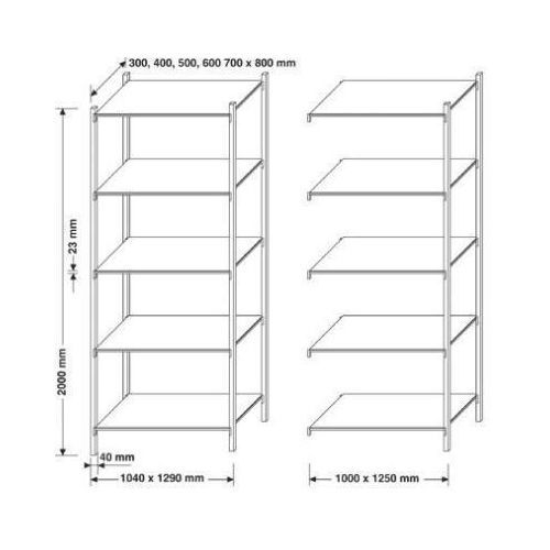 - Grundsektion: består af 4 stolper med plastfødder 5 hylder af rørprofiler 5 dækplader af masonit.