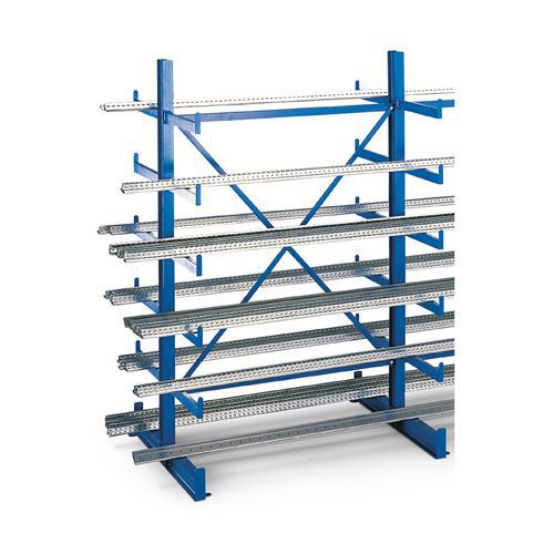 Opstanderne er forsynet med fastsvejsede bærearme med afrulningssikring. Opstanderne er fremstillet af varmvalsede IPE-profiler og bærearmene af U-profiler. Gulvforankring ved hjælp af medfølgende gulvankre. Åben reol til langt gods. Meget hurtig at montere takket være de fastsvejsede bærearme. Som standard forsynet med afrulningssikring. Ubegrænsede udbygningsmuligheder. Dobbeltsidet grundreol. Komplette reoler med bærearme med hage (L = 50 cm). Maks. belastning/arm: 200 kg.