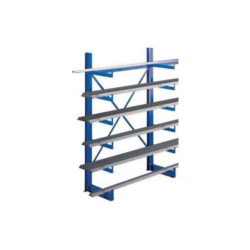 Opstanderne er forsynet med fastsvejsede bærearme med afrulningssikring. Opstanderne er fremstillet af varmvalsede IPE-profiler og bærearmene af U-profiler. Gulvforankring ved hjælp af medfølgende gulvankre. Åben reol til langt gods. Meget hurtig at montere takket være de fastsvejsede bærearme. Som standard forsynet med afrulningssikring. Ubegrænsede udbygningsmuligheder. Enkeltsidet grundreol. Komplette reoler med bærearme med hage (L = 50 cm). Maks. belastning/arm: 200 kg.