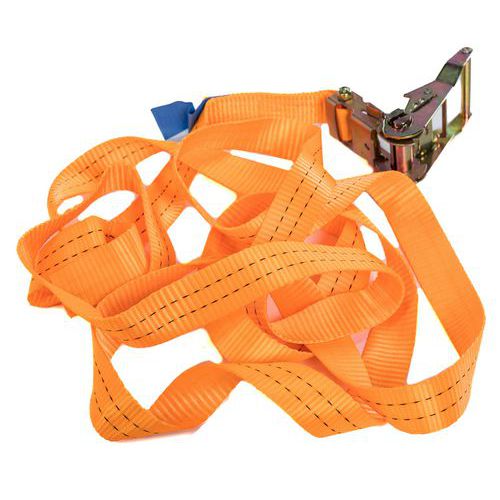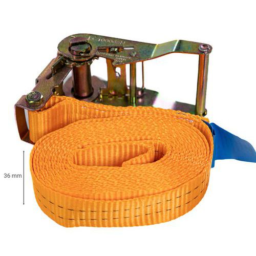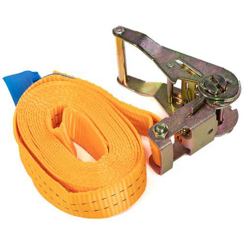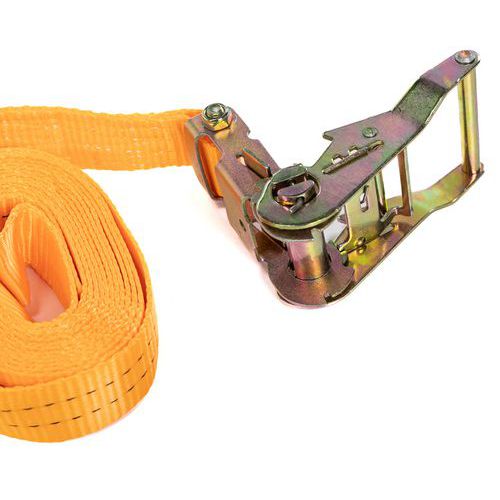 Lukkesystem med strammer med spærhage til gradvis fastsurring af lasten og kontinuerlig justering af remmen. Meget robust, modstår råd og har høj slidstyrke.