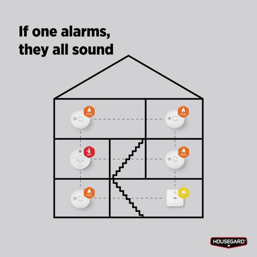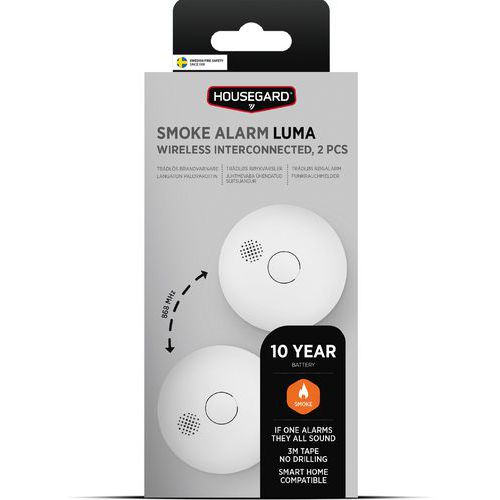 - Housegard Luma er en trådløs, serieforbindelig røgalarm med optisk detektionskammer i 2-pak med indbygget 10-års batteri.