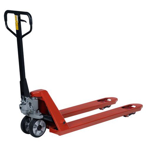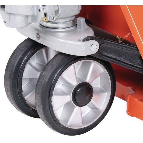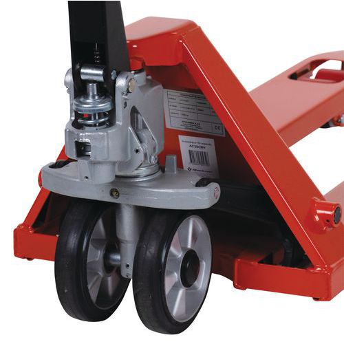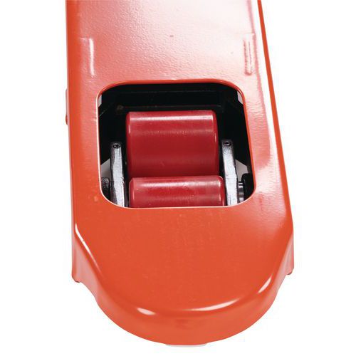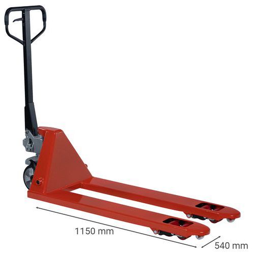 | Varenavn | Palleløfter, Kapacitet: 2500 kg, Gaffel, længde: 1150 mm, Type af hjul: Boggies, Styrehjul, materiale: Gummi |