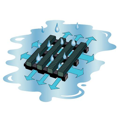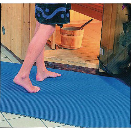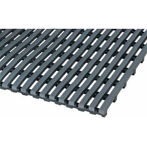 Kan modstå temperaturer på op til 60°C. Konvekse profiler, sammensatte i gittermønster, PVC. Ideel på kanten af svømmebassiner, i bruseren, omklædningsrum, forretninger og overalt hvor der sker passage af våde arealer. Let at lægge på og skære til. Skridsikker. Hygiejnisk, ingen porer. Antibakteriel. Lyddæmpende. Slidstærk. 4-vejs selvdrænering. Bestilles i hele meter!