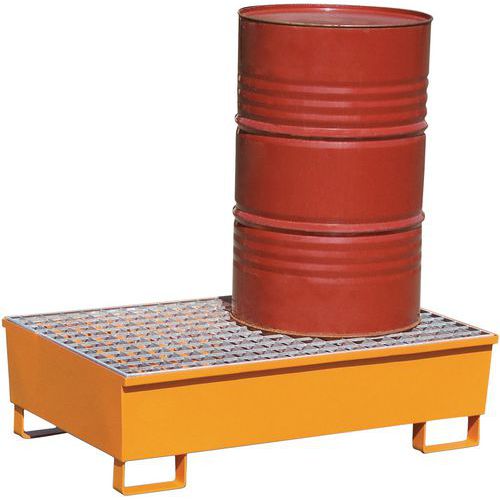 - Miljøbeskyttelsespalle, der opsamler eventuel spild og lækage. Fremstillede af 2 mm stål, galvaniseret eller epoxylakeret i orange RAL 2000. Risten er i galvaniseret stål, og er aftagelig for at lette rengøringen. Modstandsdygtig overfor kemikalier. Kan flyttes med truck uden belastning.