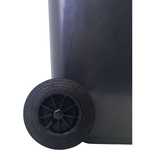 UV-bestandig beholder. Nem bevægelse af beholderen takket være disse 2 solide hjul. Nem vedligeholdelse af beholderen takket være dens glatte plastikoverflade. Låg i forskellige farver for at lette affaldssortering. Til udendørs brug