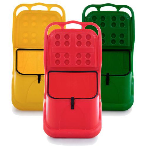 Mobil vogn til flere anvendelser (grus/salt, sand, absorbenter, gødning, foder, havearbejde, kul osv.). Velegnet til indendørs og udendørs/opbevaring. Kompakt og pladsbesparende design med robuste gummihjul og vippelåg til vandafledning. Kapacitet 75 liter. Ergonomiske håndtag til nem brug- både at trække og skubbe vognen foran dig. Fremstillet i Storbritannien