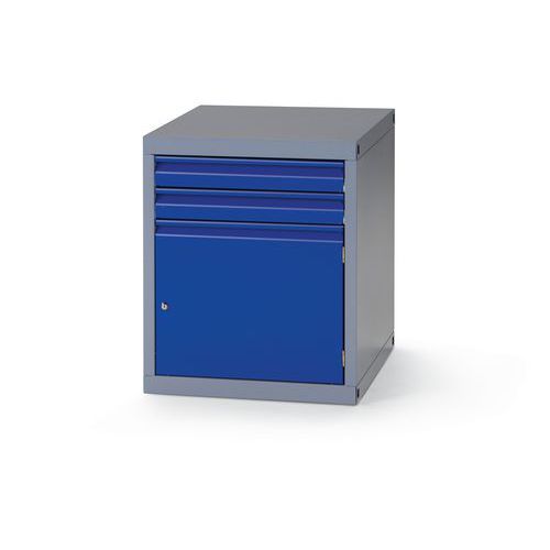 Udvid dit arbejdsbord med denne boks til arbejdsborde med skab og skuffer. Skuffer på rullelejer, så de er nemme at åbne og lukke. Dør med lås til at opbevare dine ejendele sikkert. 100 % skuffeåbning og central lukning.
