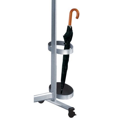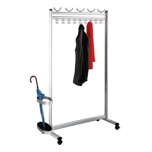 Førsteklasses knagerække i aluminium med meget høj kapacitet. Hængende skinne udstyret med kroge til hatte og beklædningsgenstande. Knagerækken er mobil takket være de 4 hjul, som kan låses individuelt. Paraplystativet kan placeres på højre eller venstre side efter behov.