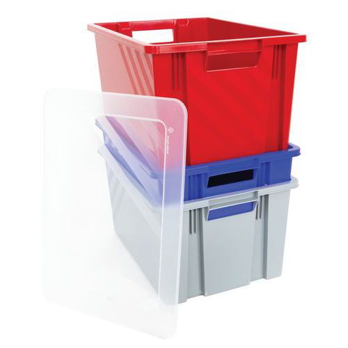 Stabelbar beholder med åbne håndtag for nem håndtering.
