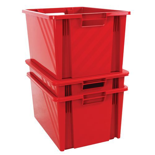 Stabelbar beholder med åbne håndtag for nem håndtering.