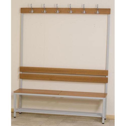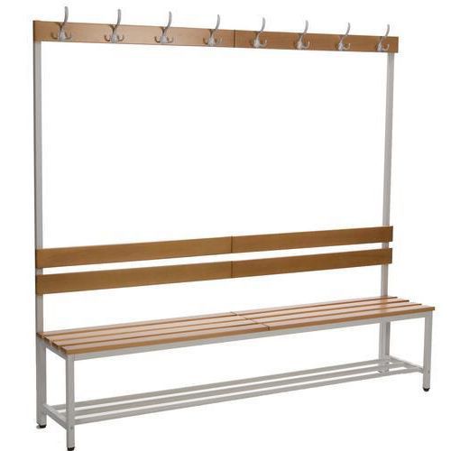 Stabil omklædningsbænk med skohylde som standard, inkl skinne og 5, 6 eller 8 ophængskroge til tøj. Træsort: avnbøg. Lackeret stativ. Leveres umonteret