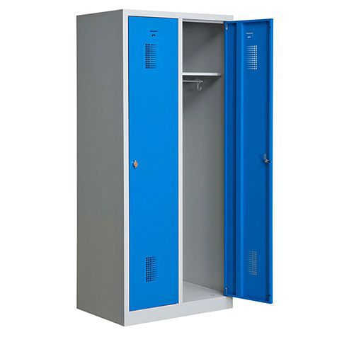 Garderobeskab Bravo 400, et fremragende valg til omklædningsrum i de fleste miljøer, såsom butikker, værksteder, skoler, hospitaler, kontorer. Skabene leveres med klinke til hængelås eller cylinderlås (to nøgler medfølger). Hygiejnisk konstruktion, der er ventilationshuller både øverst og nederst i døren. Har som standard fladt tag, og som tilbehør findes skråt tag, ben og siddebænke. Skabene er fremstillet af stålplade og opfylder Arbejdstilsynets krav. Tøjskab Bravo 400 leveres med højrehængt dør.