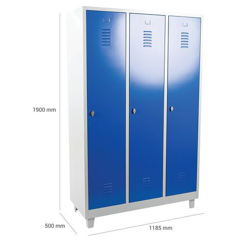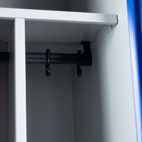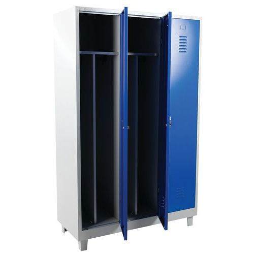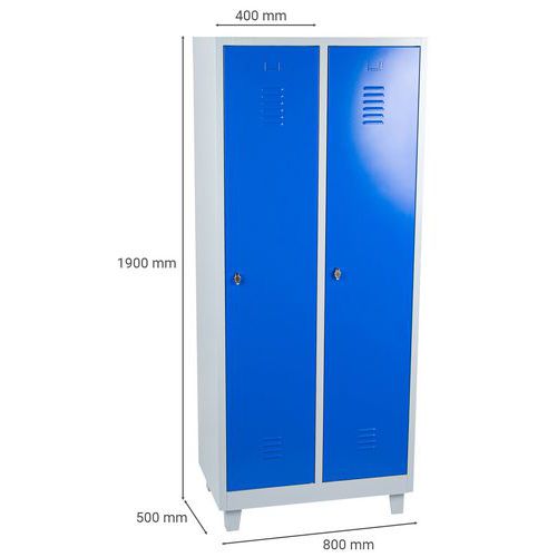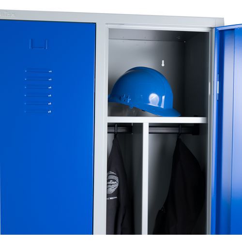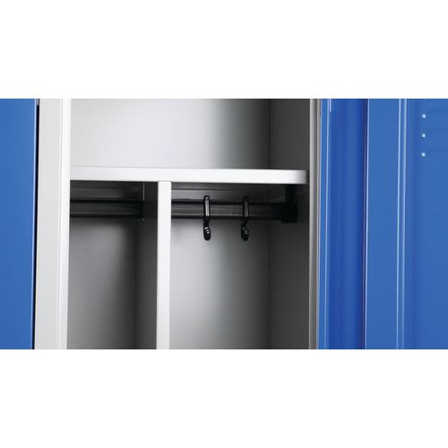 Døre, der er forstærket med usynlige hængsler. Optimal åbning på 180°. Hygiejnisk: ventilation i toppen og bunden af klædeskabets døre. 1 skillevæg til rent og beskidt tøj. 1 hylde, 1 stang og 2 kroge per rum, huller til vægmontering og etiketholder.