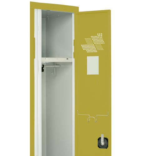 Ventilation på lågernes over- og underdel samt på skabets underside. Afrundede hjørner, som øger sikkerheden for brugeren. Lukket profil giver bedre robusthed. Indbrudssikre låger. Åbning til 180°. 1 hylde, 1 stang og 2 bøjler. 1 magnetisk spejl og 1 håndklædestang medfølger.