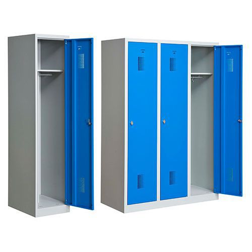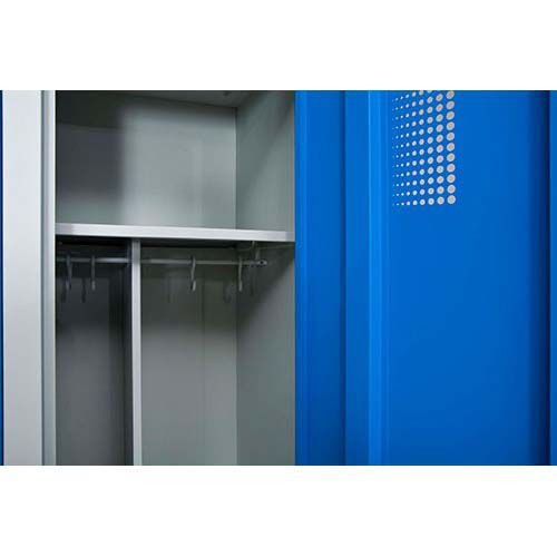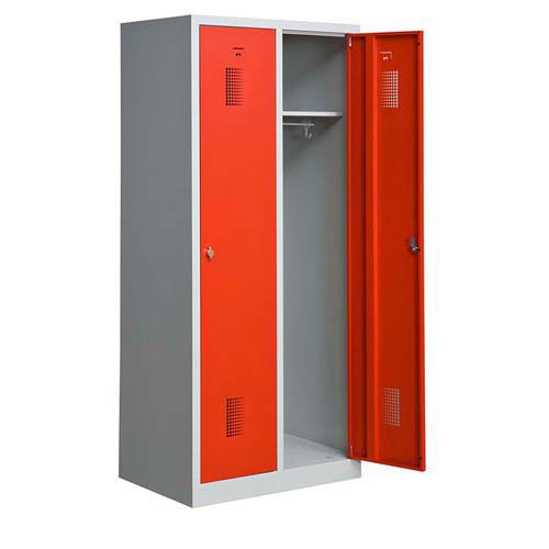 - Til omklædningsrum i forskellige miljøer, butikker, værksteder, skoler, sygehuse, kontorer mm. Skabet leveres med klinke til hængelås eller cylinderlås (to nøgler medfølger). Døren er desuden forsynet med ventilationshuller. Skabet har flad top og kan fås med ben eller siddebænke som ekstraudstyr. Skabet er fremstillet i stålplader. Opfylder kravene fra den svenske arbejdsmiljøstyrelse. Højrehængt dør.