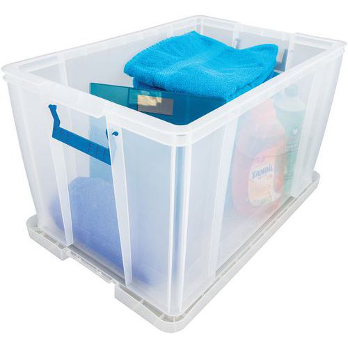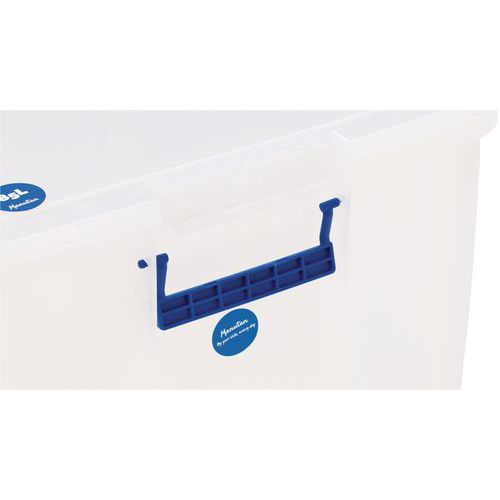 Opbevaringsbeholder og låg - robust og holdbar beholder til alle former for opbevaring. Håndtagene gør det nemt og bekvemt at transportere den. Beholderen er gennemsigtig, hvilket gør det lettere at se og finde tingene indeni.