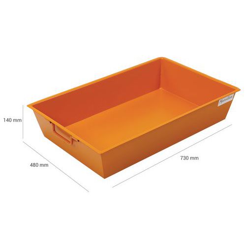 Bakke til opsamling af spild og lækage fra tønder og dunke. Fremstillet i 1,5 mm tyk pulverlakeret metalplade. Perfekt til opbevaring af batterier. Modstandsdygtig overfor korrosion og de fleste kemikalier, såsom olier, terpentin, opløsningsmidler, syrer og baser.