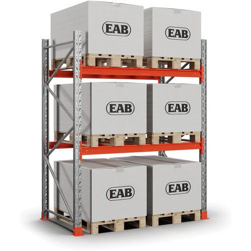 Pallereol Omega, grundsektion - stærk og robust pallereol, der opfylder alle sikkerhedskrav i de europæiske standarder SS-EN 15512, SS-EN 15620, SS-EN 15629 og SS-EN 15635. Fleksibel - med EAB pallereoler kan du hurtigt og nemt skabe et rationelt og effektivt flow, uanset om du har et højt, lille, smalt, manuelt eller automatiseret lager. Pallereolen er bygget af kun to komponenter, gavle og bærebjælker, hvilket gør den nem at montere. Leveres med en bundplade, der er tilpasset til fastgørelse på betongulv, hvilket giver en meget god fastgørelse til gulvet og beskytter den nederste del af stolpen. Søjlen er stabiliseret ved hjælp af indramning. Stiverne i enden af Omega pallereolen er designet i firkantede rør, hvilket giver stærke stivere og en meget stabil ende, der tillader høje sektionsbelastninger. Overfladebehandling: Pallereolen leveres galvaniseret, og bjælker, fodplader og andet tilbehør er malet orange. Gavlene leveres komplet med vandrette og diagonale stivere, fodplader samt skruer og møtrikker. Pakkens indhold: 2 stk gavle, 8 stk bærebjælker, 1 stk skilt med belastningsdekal (yderligere findes som tilbehør), beslag, 8 stk betonskruer. En basissektion kan nemt suppleres med en udvidelsessektion, hvis behovet for palleopbevaring ændrer sig.