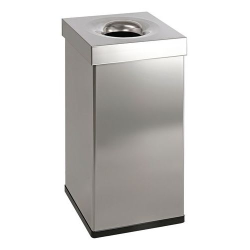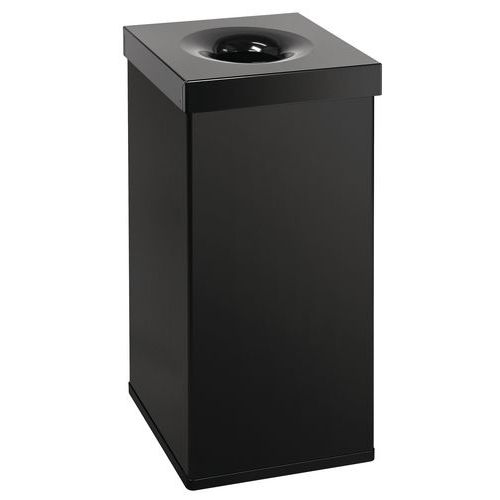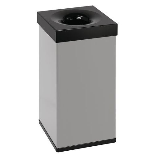 Firkantet brandsikker affaldsbeholder. Base lavet af højkvalitets aluminium eller rustfrit stål og låg af rustfrit stål, alle dele er pulverlakeret.