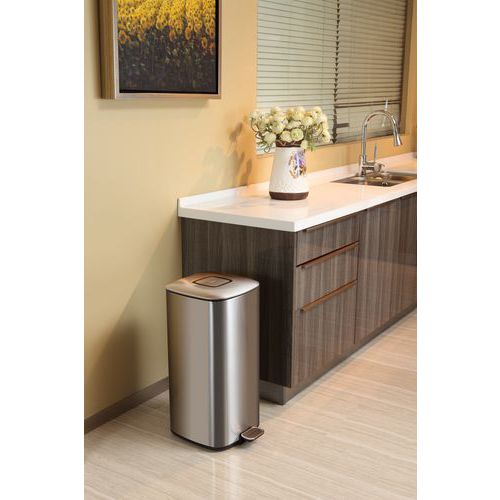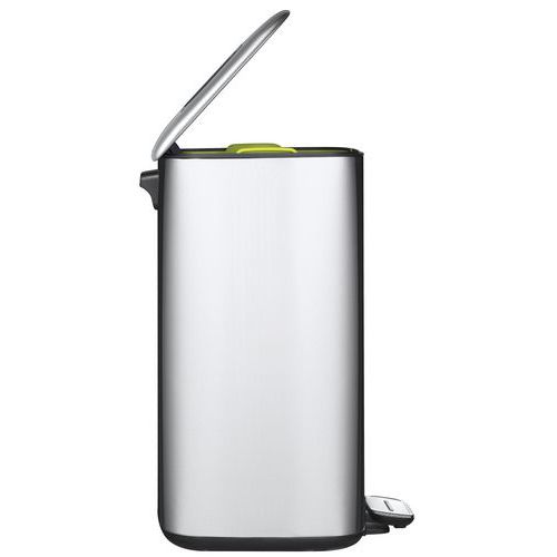 Firkantet affaldsspand med pedal, lavet af børstet rustfrit stål med anti-fingeraftryk finish.