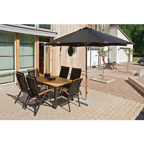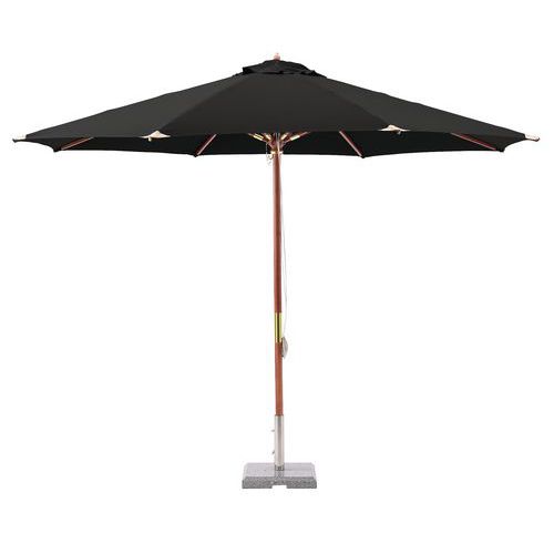 | Varenavn | Parasol 335 træ/polyester, Form: Rund, Farve: Sort, Vægt: 12 kg, Ø: 335 cm, Højde: 275 cm |