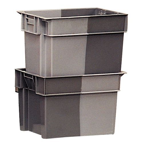 Stabelbar til 60 %, så der spares plads. Let håndtering med brede, ergonomiske håndtag. Glat bund, der betyder, at den kan bruges sammen med alle typer transportbånd. Tofarvet struktur, gør den let at stable.
