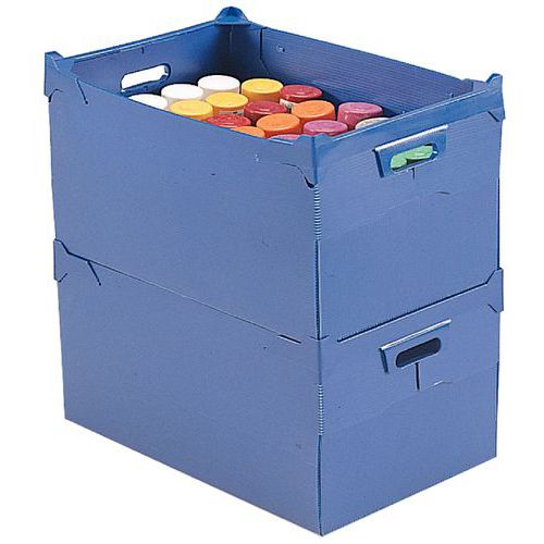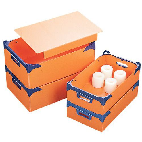 Meget holdbar med plastprofilforstærkede korte sider. Nem at håndtere med håndtag og styreriller. Kassen leveres usamlet. Nem at samle takket være formpressede foldemærker.