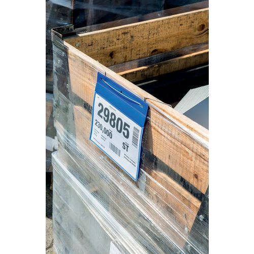 Plastlomme med trådbøjle til brug på f.eks. netgitter, pallerammer og pallekasser. Med beskyttende låg...