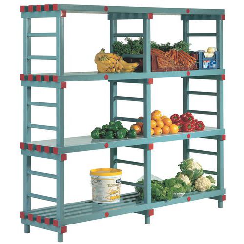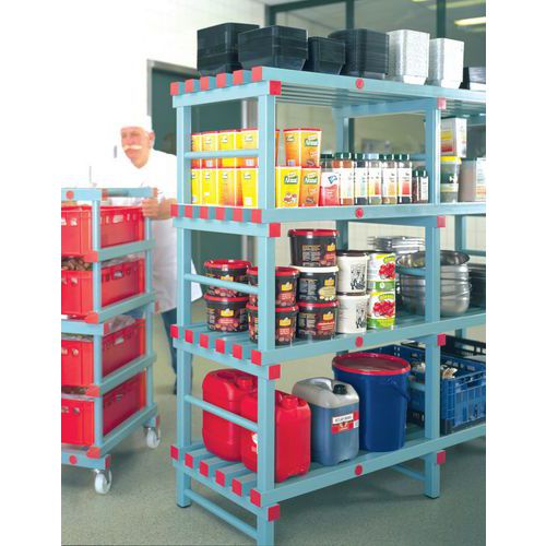 Grundsektion: består af 3 mellemhylder, 1 tophylde. En hylde i plast, som kan modstå stød. Meget let at montere uden brug af værktøj takket være modulsystemet. Poly-Store er fremstillet i firkantede slagfaste plastprofiler (50 x 50 mm) og er desuden helt cadmiumfri. Er derfor velegnede til levnedsmiddelindustrien. De afrundede profiler forebygger skader på tilbehør og emballage. Åbne hylder, der sikrer god luftcirkulation. Afstand = Luft imellem hylderne
