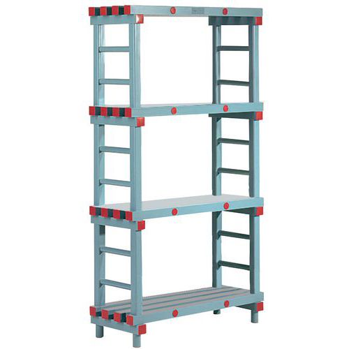 Grundsektion: består af 3 mellemhylder, 1 tophylde. En hylde i plast, som kan modstå stød. Meget let at montere uden brug af værktøj takket være modulsystemet. Poly-Store er fremstillet i firkantede slagfaste plastprofiler (50 x 50 mm) og er desuden helt cadmiumfri. Er derfor velegnede til levnedsmiddelindustrien. De afrundede profiler forebygger skader på tilbehør og emballage. Åbne hylder, der sikrer god luftcirkulation. Afstand = Luft imellem hylderne