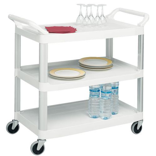 | Varenavn | Plastvogn med 3 hylder, Kapacitet: 135 kg, Totalhøjde: 960 mm, Totalbredde: 508 mm, Totallængde: 1032 mm |