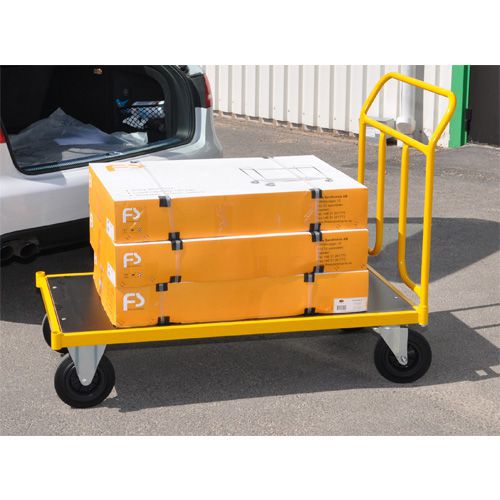 Gul, pulverlakeret platformsvogn, robust udført med lamineret hylde. Leveres umonteret. Lavet i EU Kapacitet (kg) : 400