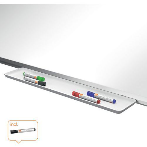 - Whiteboarden er udstyret med et stort tilbehørsrum med klips til opbevaring af whiteboardpenne, viskelæder, rengøring og magneter.