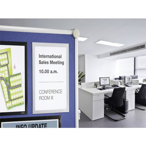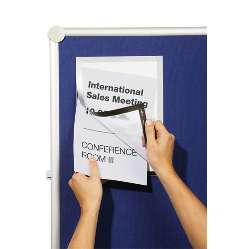 - Smart ramme i A4-format til fastgørelse på tekstilflader, såsom skillevægge og akustikplader med tekstilflade. Fint Burretape på bagsiden og transparent front med magnetlukning, som gør det nemt at skifte indhold. Stående eller liggende A4-format. Husk: Produktet skal fjernes fra tekstiloverfladen ved forsigtigt at trække det sidelæns, i vandret retning. Undgå at trække det af fra oven eller fra neden. Tekstiloverfladen kan blive lidt nopret eller få løse tråde der, hvor produktet har siddet. Pas på, at bagsiden ikke kommer i kontakt med dit tøj, når du sætter produktet op, da den fine Burretape på bagsiden kan beskadige dit tøj.