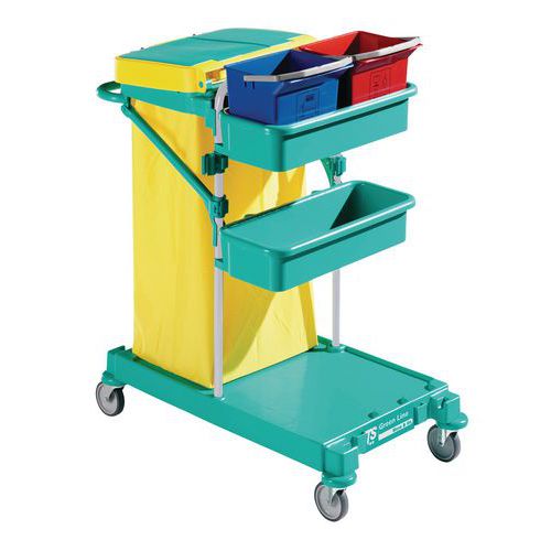 - Optimal arbejdskomfort. Robust grundkonstruktion i plast med lakerede stålrør. Hjul med sikkerhedskanter. En blå og en rød spand (6 liter) med ergonomisk håndtag, holder til affaldssæk på 120 liter og skaftholder.