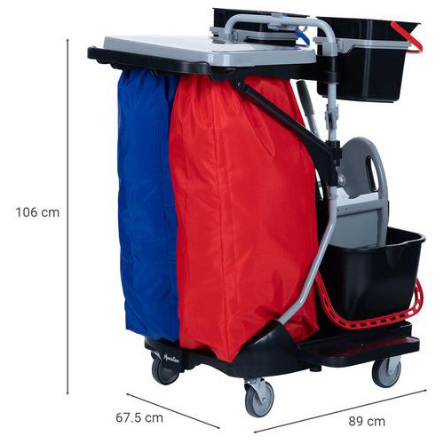 | Varenavn | Rengøringsvogn med presse, plastiksæk, 2x4 L spande , Volumen: 30 L, Farve: Sort, Højde: 106 cm |