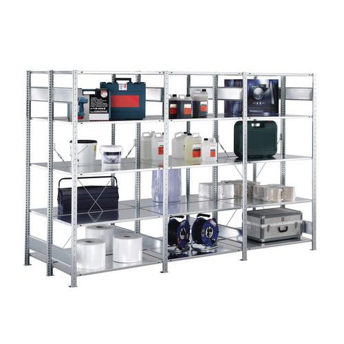 - Påbygningssektion: består af 4 stolper, 10 hylder og 4 forstærkninger. Tilbehør til Reol Easy-Fix dobbelt: Grundsektion.
