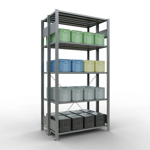 - Grundsektion: består af 8 stolper, 10 hylder, 8 forstærkninger og 1 kryds med tilhørende strammer. Enkel og hurtig montering. Let at udvide.
