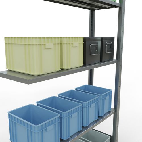 - Påbygningssektion: består af 4 stolper, 10 hylder og 4 forstærkninger. Tilbehør til Reol Easy-Fix dobbelt: Grundsektion.